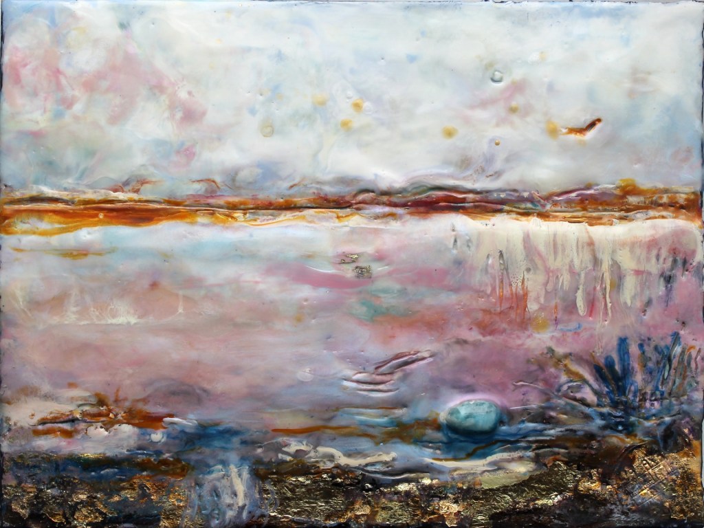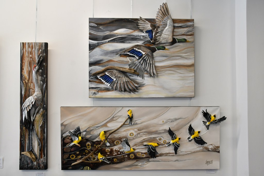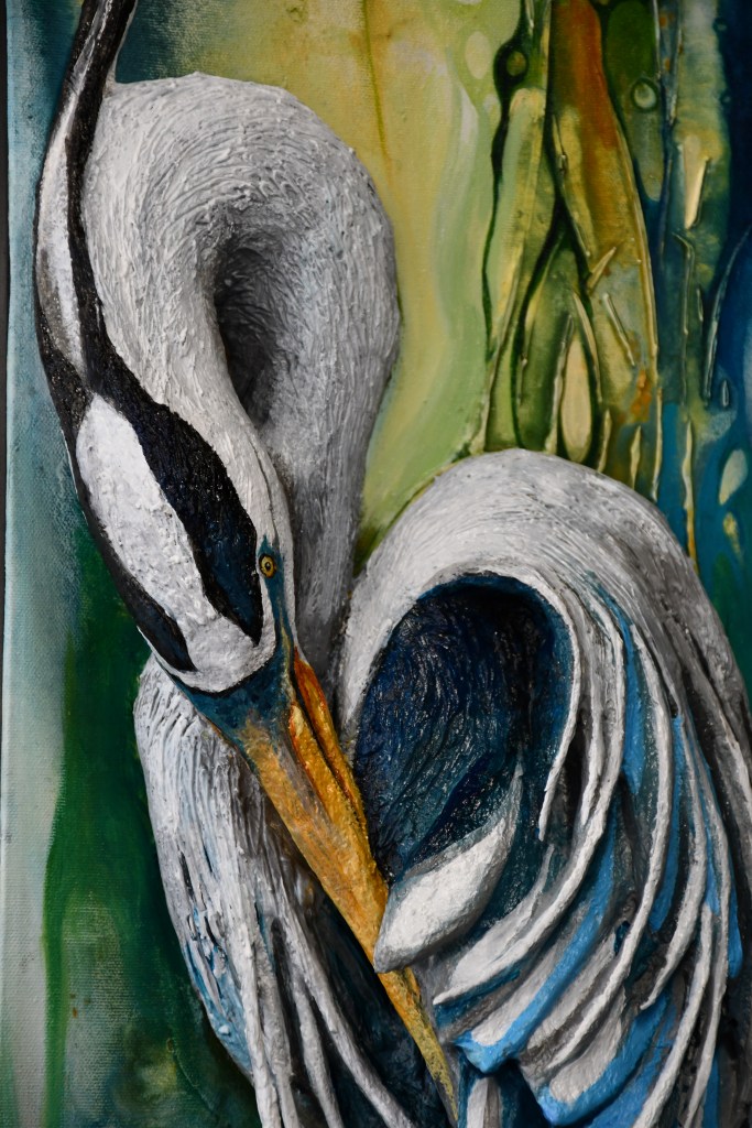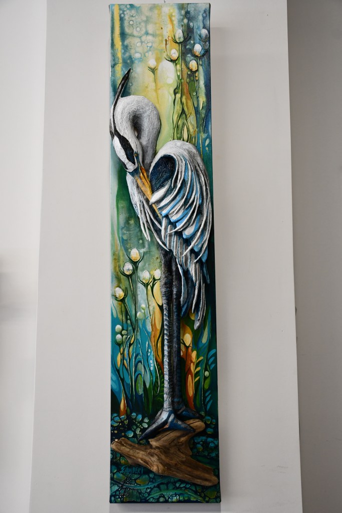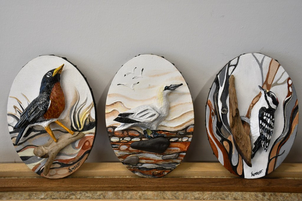 Artiste spécialisée dans la création de pièces uniques en haut‑relief sur toile, elle fait émerger le sujet du tableau en intégrant la peinture à des éléments tridimensionnels. Elle modèle des oiseaux en papier mâché qu’elle solidifie jusqu’à leur donner la présence du bois, et y ajoute de véritables fragments de bois de grève récoltés au fil de ses promenades en nature. Son travail se situe ainsi à la frontière de l’image et de l’objet