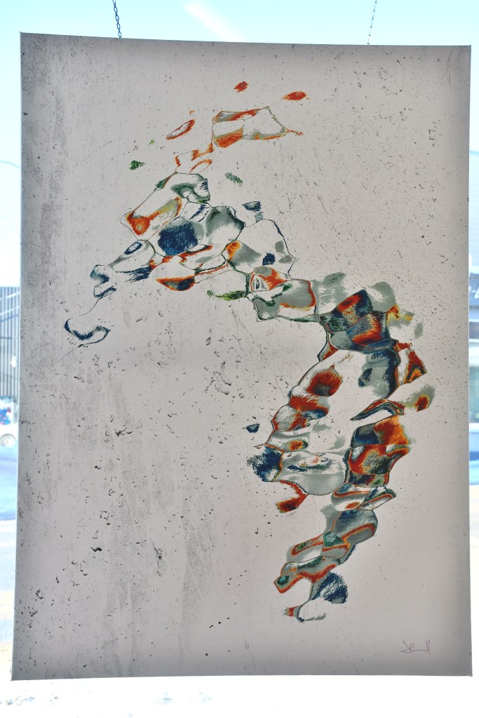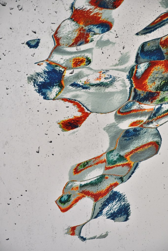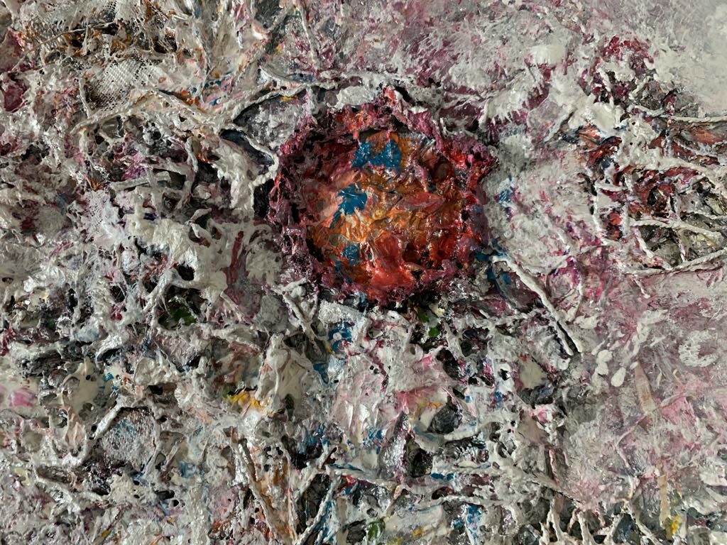 Elle explore la matière, la texture, les couleurs, leurs transparences superposées, l’orchestration des formes, le dynamisme ainsi que les harmonies colorées sur de grands formats, à l’acrylique, dans un geste libre et spontané, imprégné de l’émotion du moment.