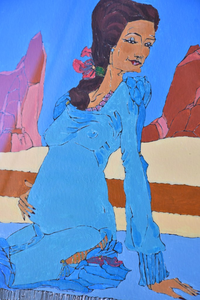 Elle peint des personnages et des paysages, souvent traversés par des gestes ou des actions qui laissent deviner un récit. Ces scènes deviennent des fragments de vie, des trajectoires où l’humain se mesure à son environnement. Les couleurs contrastées qu’elle emploie révèlent les tensions entre lumière et obscurité, fragilité et force, solitude et rencontre.