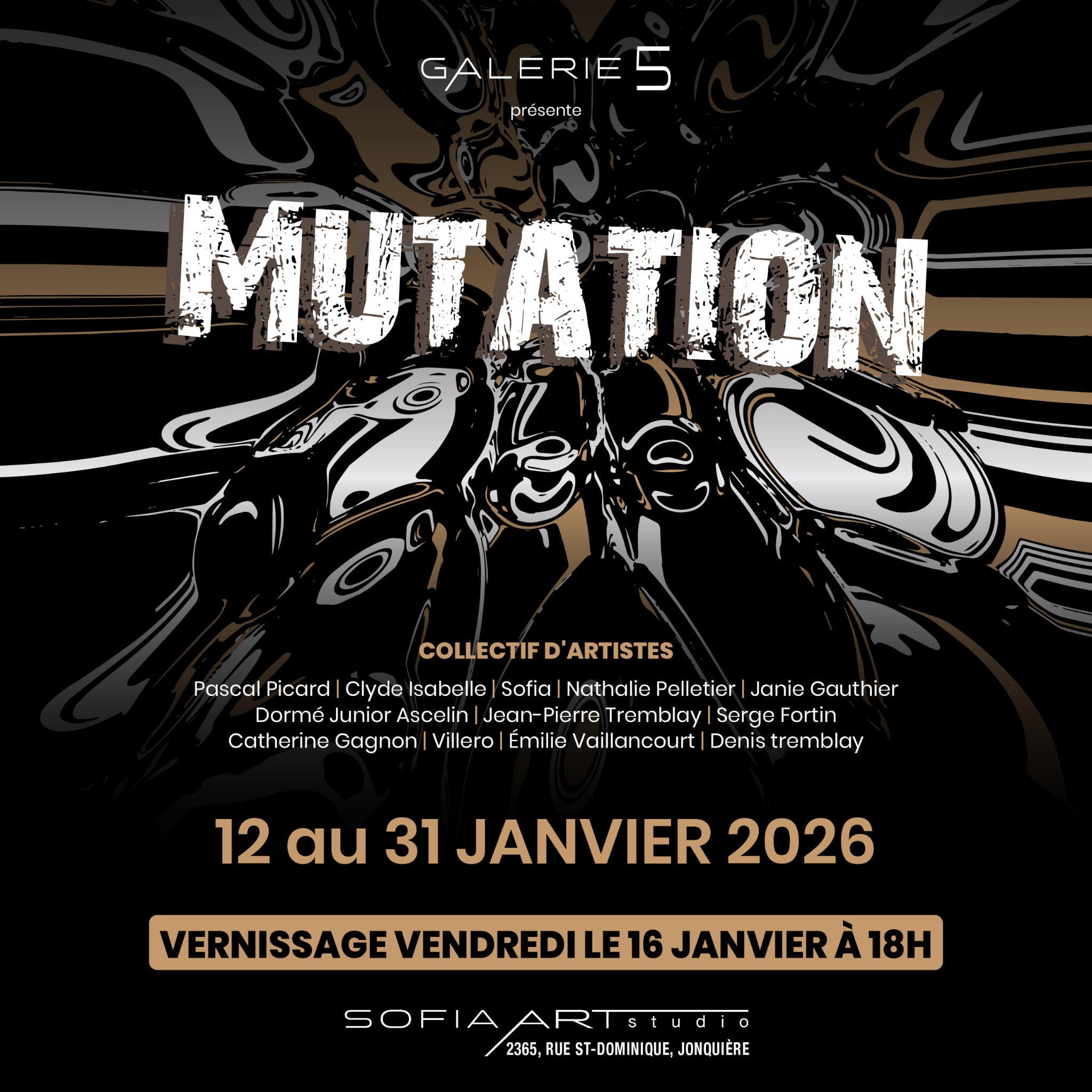 | Programmation 2026 MUTATION Collectif d’artistes 12 – 31 janvier LES COULEURS DE LA DIVERSITÉ Berceau de nos ancêtres Collectif d’artistes 2 – 28 février MARC DEMERS Exposition-Solo 2 – 28 mars CLAUDIE VILLENEUVE Exposition-Solo 6 Avril – 2 Mai JUDITH TREMBLAY Exposition-Solo 4 – 16 Mai CHRISTIAN CÔTÉ Exposition-Solo 18 – 30 mai |